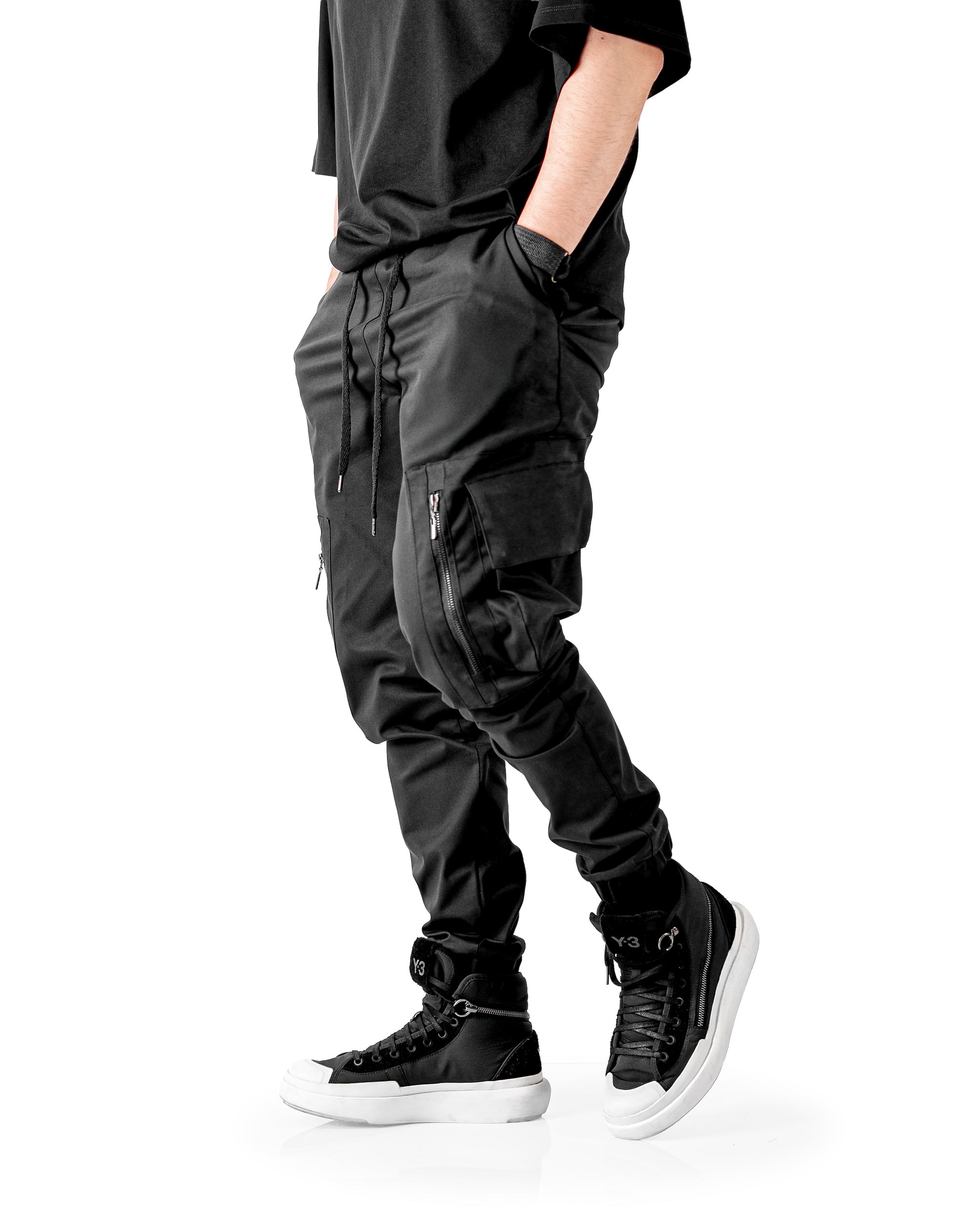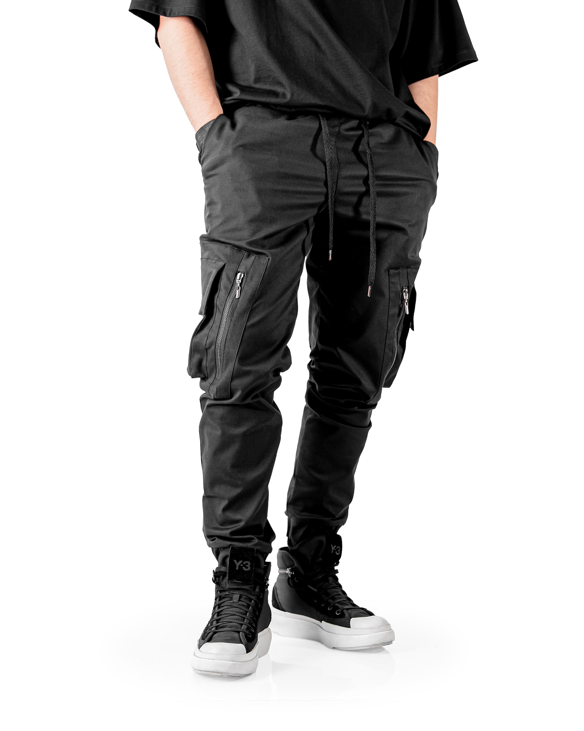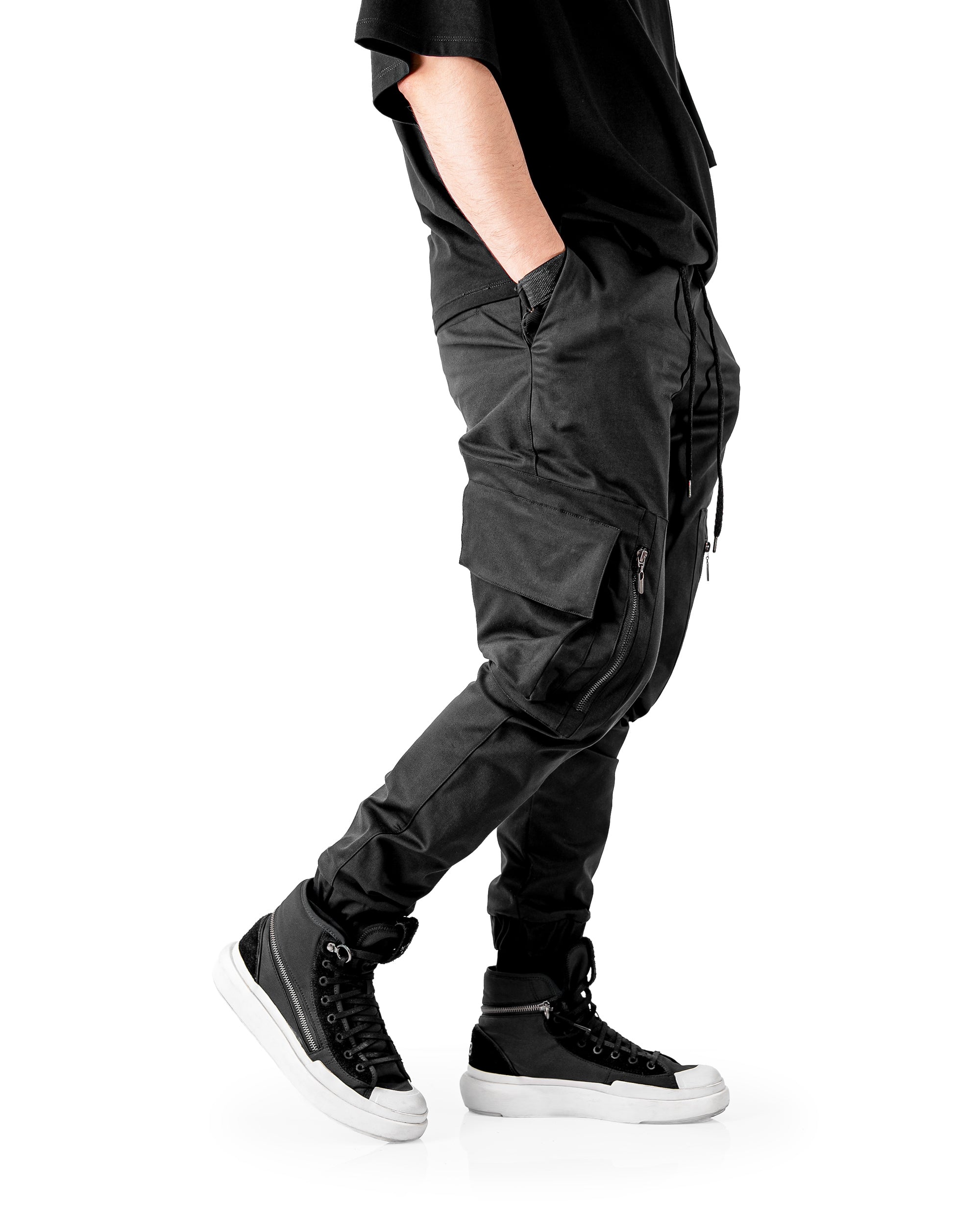 Pantalón cargo en drill stretch peinado con horma slimfit, pretina resortada y cordón con punteras metálicas. Cuenta con dos bolsillos laterales tipo cargo y bolsillos adicionales con cremallera para mayor seguridad. Sus resortes en las botas aseguran un ajuste firme, logrando un diseño funcional y versátil que combina comodidad, resistencia y estilo urbano utilitario.